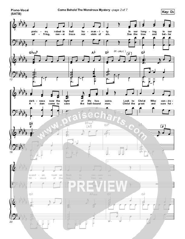 Download the sheet music for Come Behold The Wondrous Mystery by Matt Boswell / Matt Papa / Kristyn Getty, from the album His Mercy Is More - The Hymns Of Matt Boswell And Matt Papa. This song was arranged by Dustin Loehrs / John Wasson in the key of D, Db.