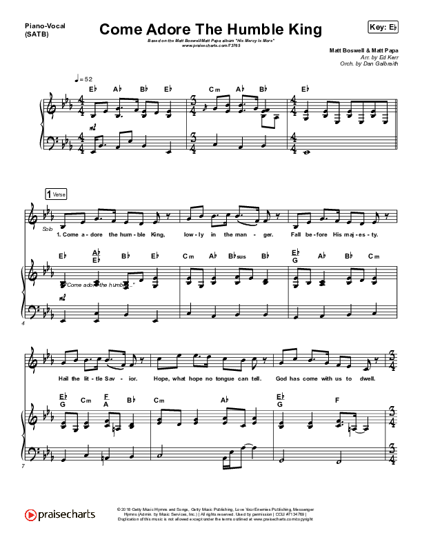 Download the sheet music for Come Adore The Humble King by Matt Boswell / Matt Papa, from the album His Mercy Is More - The Hymns Of Matt Boswell And Matt Papa. This song was arranged by Ed Kerr / Daniel Galbraith in the key of E, Eb.