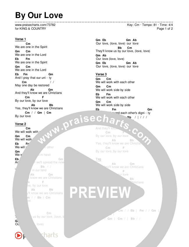 Download the PDF Chord Charts for By Our Love by for KING & COUNTRY, from the album A.D. The Bible Continues. This song was arranged by Lee Marcum in the key of Bm, Cm.