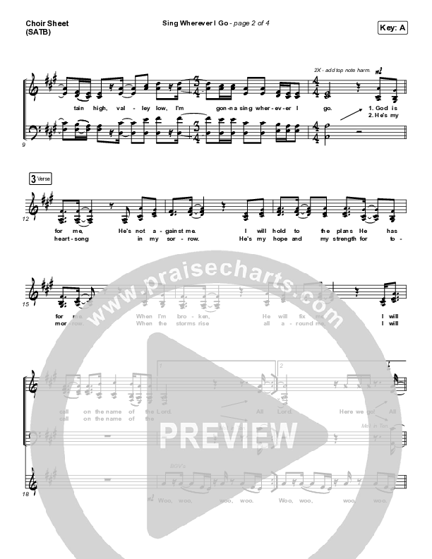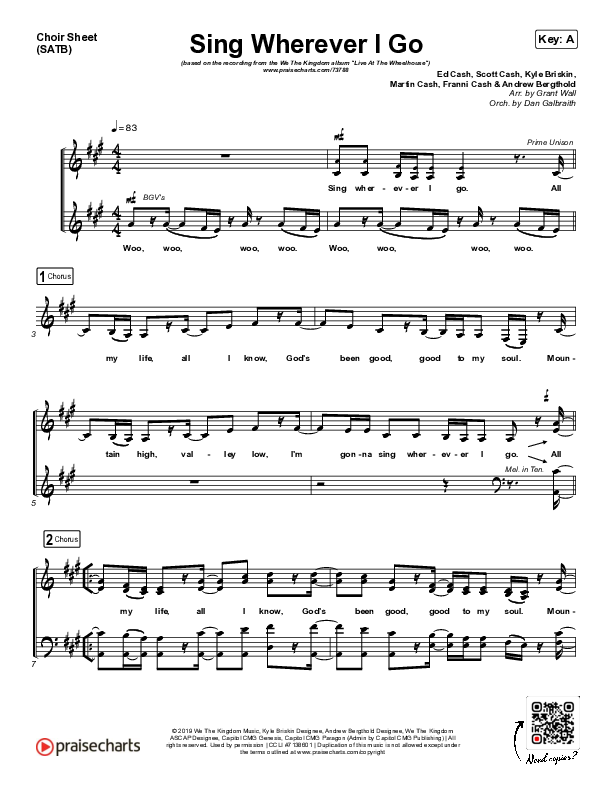 Download the Choir Sheet for Sing Wherever I Go by We The Kingdom, from the album Live At The Wheelhouse. This song was arranged by Grant Wall in the key of A, Ab, F.