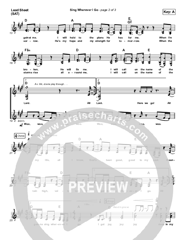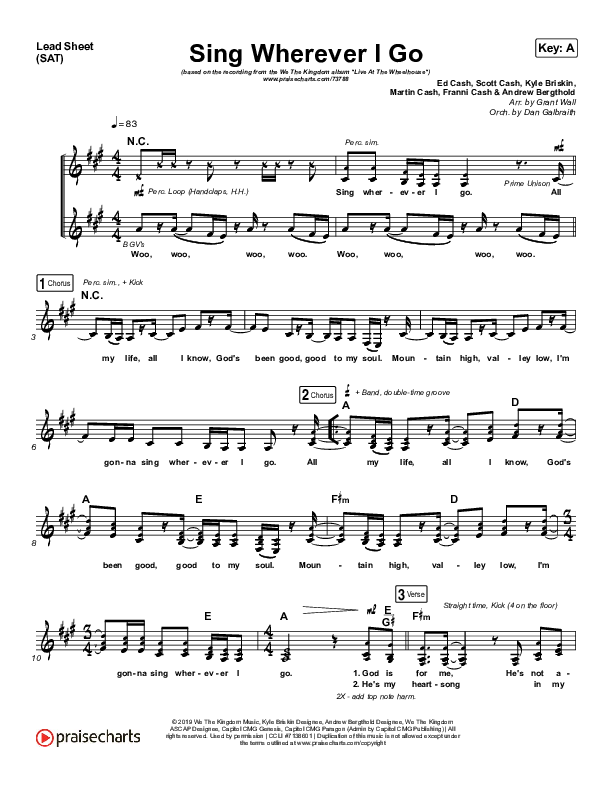 Download the sheet music for Sing Wherever I Go by We The Kingdom, from the album Live At The Wheelhouse. This song was arranged by Grant Wall in the key of A, Ab, F.