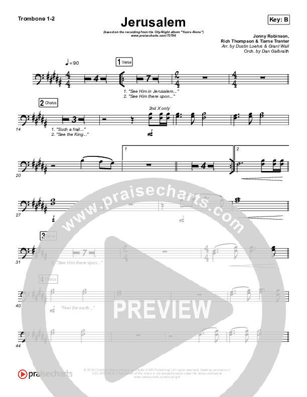 Download the Trombone 1,2 sheet music for Jerusalem by CityAlight, from the album Yours Alone. This song was arranged by Dustin Loehrs / Daniel Galbraith in the key of B, C.