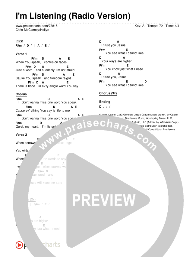 Download the PDF Chord Charts for I'm Listening (Radio) by Chris McClarney / Hollyn, from the album Fill This Place (Live).