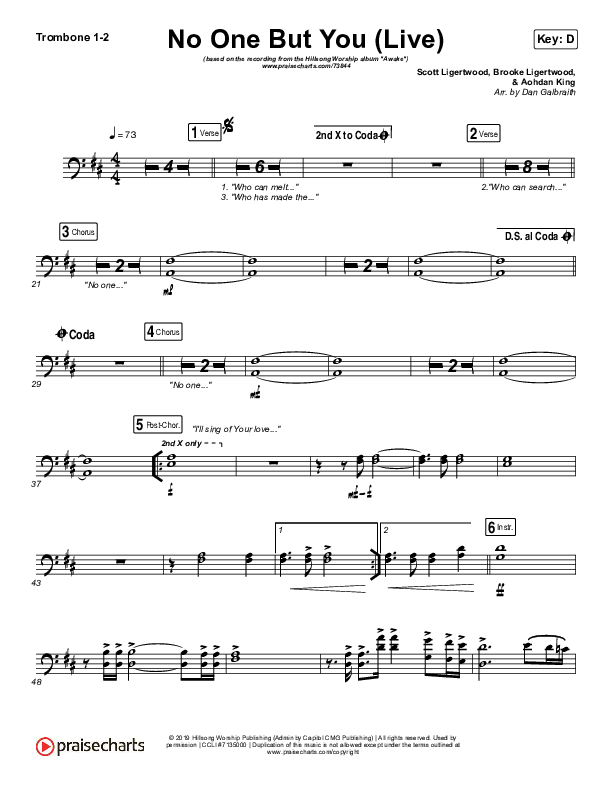 Download the Trombone 1,2 sheet music for No One But You (Live) by Hillsong Worship, from the album Awake (Deluxe). This song was arranged by Daniel Galbraith in the key of C, D.