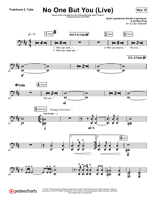 Download the Trombone 3/Tuba sheet music for No One But You (Live) by Hillsong Worship, from the album Awake (Deluxe). This song was arranged by Daniel Galbraith in the key of C, D.