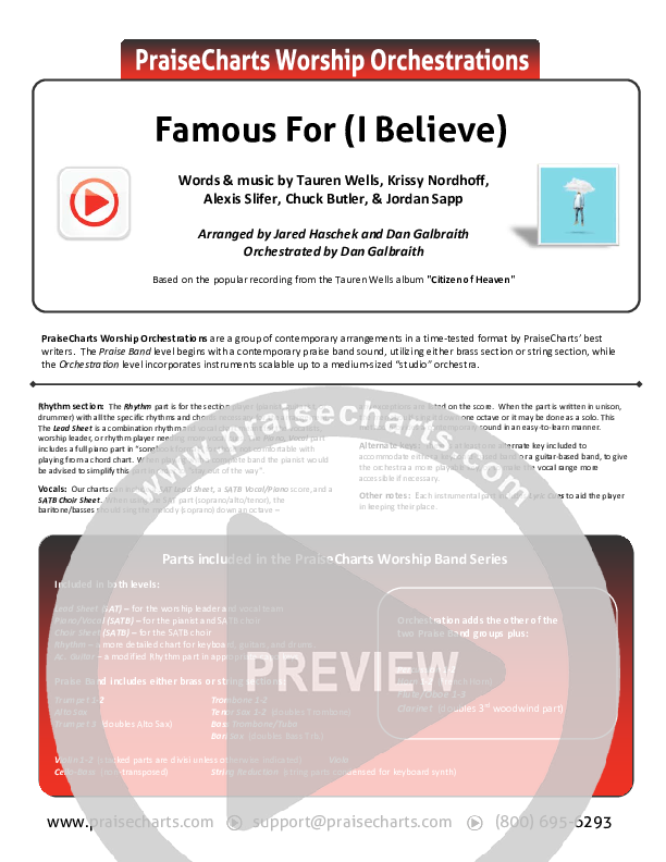 Download the Orchestration for Famous For (I Believe) by Tauren Wells, from the album Citizen Of Heaven. This song was arranged by Grant Wall / Daniel Galbraith in the key of A, Bb.