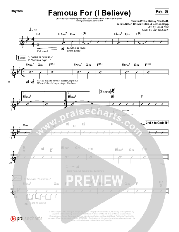 Download the Rhythm Chart for Famous For (I Believe) by Tauren Wells, from the album Citizen Of Heaven. This song was arranged by Grant Wall / Daniel Galbraith in the key of A, Bb.