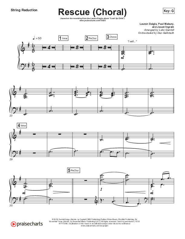 Download the Orchestration for Rescue (Choral Anthem SATB) by Lauren Daigle / Arr. Luke Gambill, from the album Look Up Child. This song was arranged by Daniel Galbraith / Luke Gambill in the key of G.