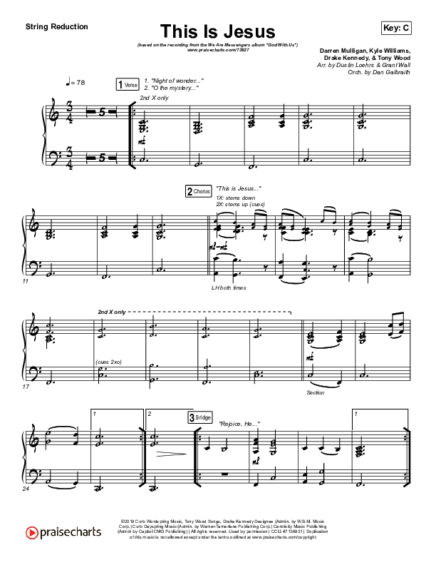 Download the Orchestration string parts for This Is Jesus by We Are Messengers, from the album God With Us. This song was arranged by Dustin Loehrs / Daniel Galbraith in the key of Bb, C.