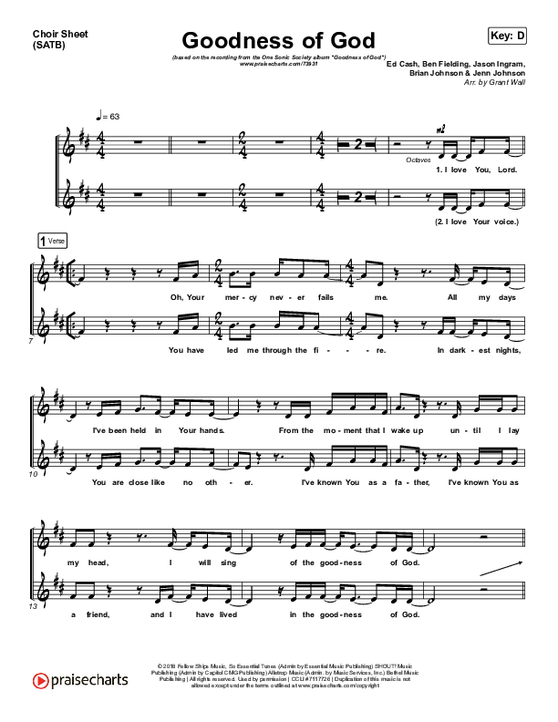 Download the Choir Sheet for Goodness Of God by One Sonic Society, from the album Goodness Of God - Single. This song was arranged by Grant Wall in the key of Bb, D, Db.