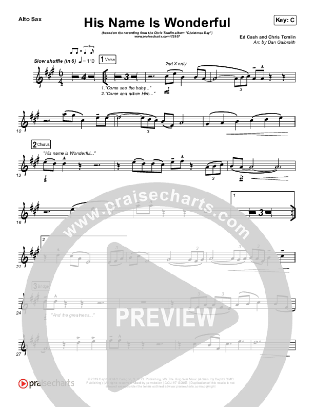 Download the AltoSax sheet music for His Name Is Wonderful by Chris Tomlin, from the album Christmas Day: Christmas Songs Of Worship. This song was arranged by Daniel Galbraith in the key of A, Bb, C, F.