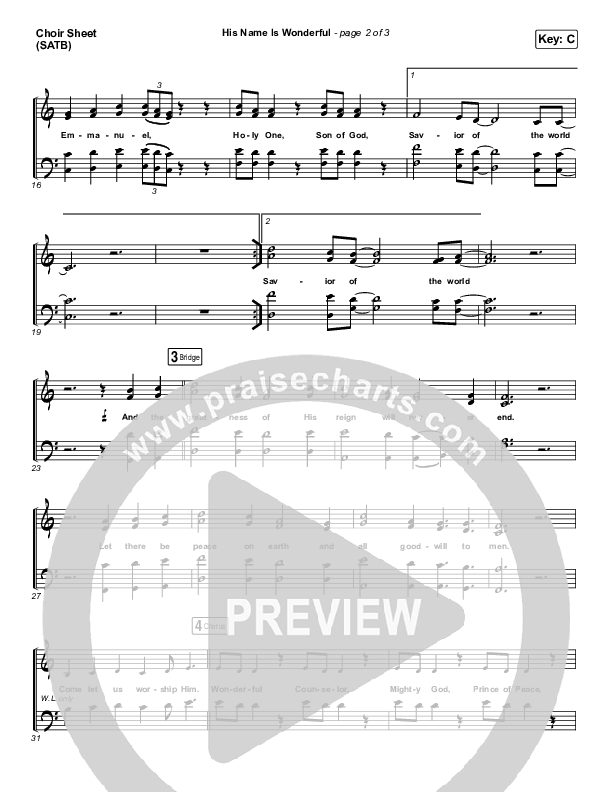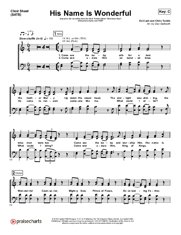 Download the Choir Sheet for His Name Is Wonderful by Chris Tomlin, from the album Christmas Day: Christmas Songs Of Worship. This song was arranged by Daniel Galbraith in the key of A, Bb, C, F.