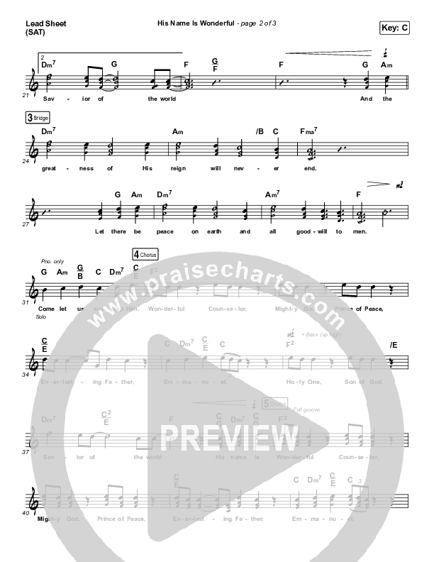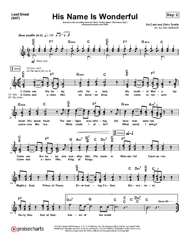 Download the sheet music for His Name Is Wonderful by Chris Tomlin, from the album Christmas Day: Christmas Songs Of Worship. This song was arranged by Daniel Galbraith in the key of A, Bb, C, F.