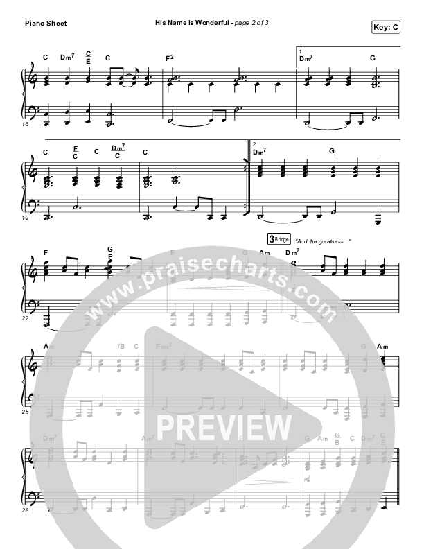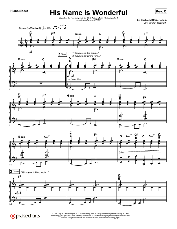Download the piano sheet for His Name Is Wonderful by Chris Tomlin, from the album Christmas Day: Christmas Songs Of Worship. This song was arranged by Daniel Galbraith in the key of A, Bb, C, F.