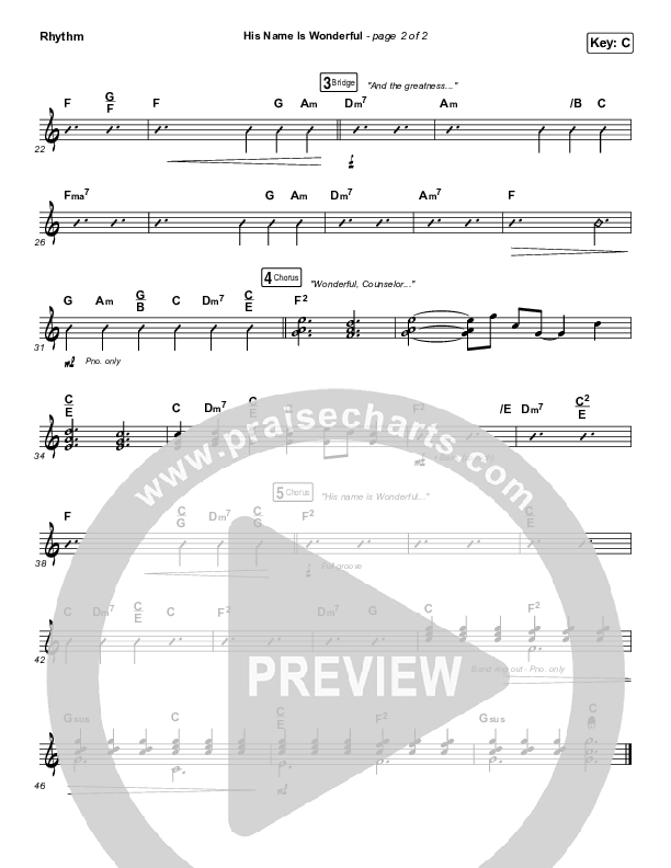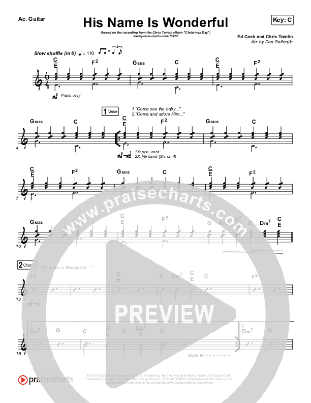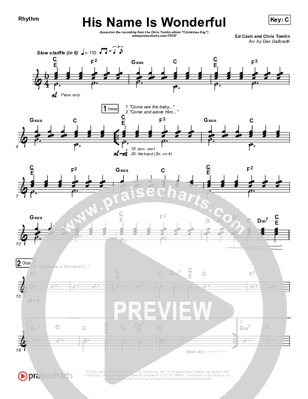 Download the Rhythm Chart for His Name Is Wonderful by Chris Tomlin, from the album Christmas Day: Christmas Songs Of Worship. This song was arranged by Daniel Galbraith in the key of A, Bb, C, F.