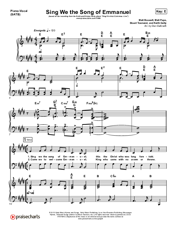 Download the sheet music for Sing We The Song Of Emmanuel by Matt Boswell / Matt Papa / Keith & Kristyn Getty, from the album Sing! An Irish Christmas - Live At The Grand Ole Opry House. This song was arranged by Daniel Galbraith in the key of E, Eb.