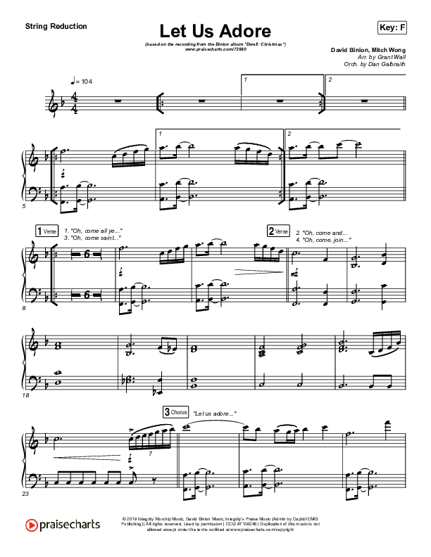 Download the Orchestration for Let Us Adore by David & Nicole Binion, from the album Dwell: Christmas. This song was arranged by Grant Wall / Daniel Galbraith in the key of F, G.