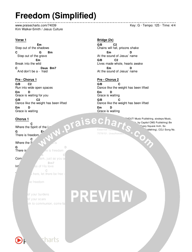 Download the PDF Chord Charts for Freedom (Simplified) by Jesus Culture / Kim Walker-Smith, from the album Simplified Worship.