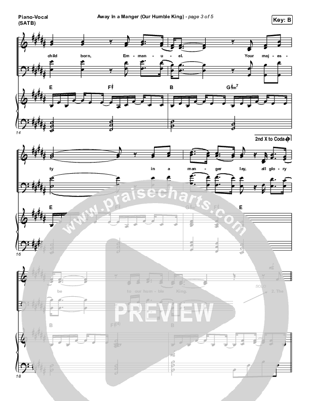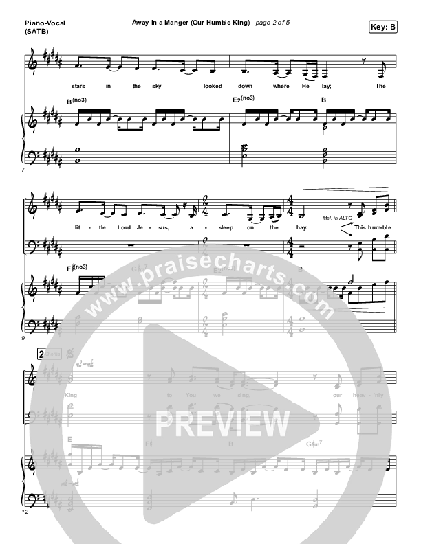Download the sheet music for Away In A Manger (Our Humble King) by Caleb & Kelsey, from the album Christmas Worship. This song was arranged by Lee Marcum / Daniel Galbraith in the key of B, Bb.