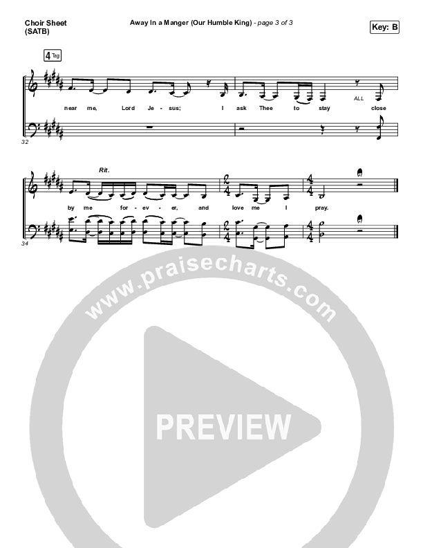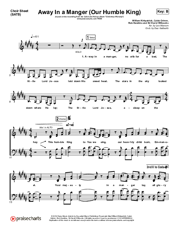 Download the Choir Sheet for Away In A Manger (Our Humble King) by Caleb & Kelsey, from the album Christmas Worship. This song was arranged by Lee Marcum / Daniel Galbraith in the key of B, Bb.