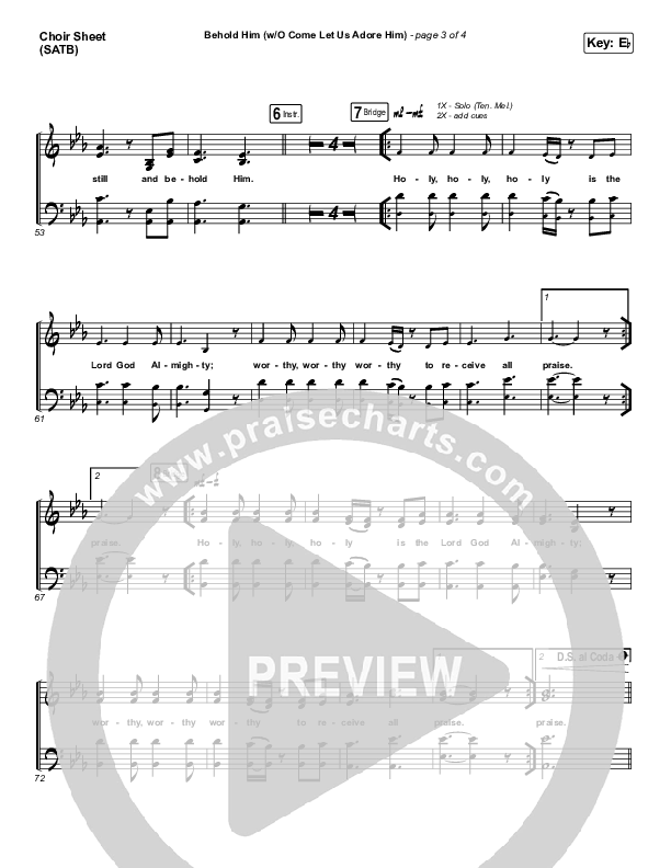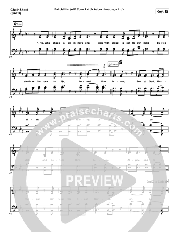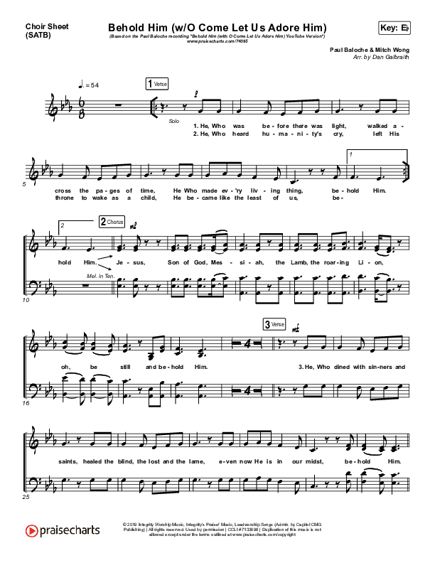 Download the Choir Sheet for Behold Him (with O Come Let Us Adore Him) by Paul Baloche, from the album Behold Him - Single. This song was arranged by Daniel Galbraith in the key of D, Eb.