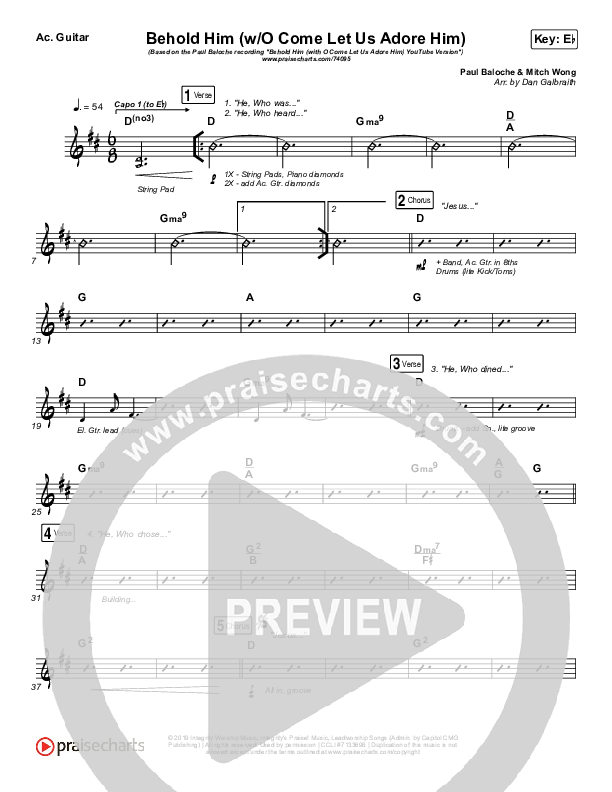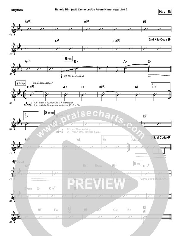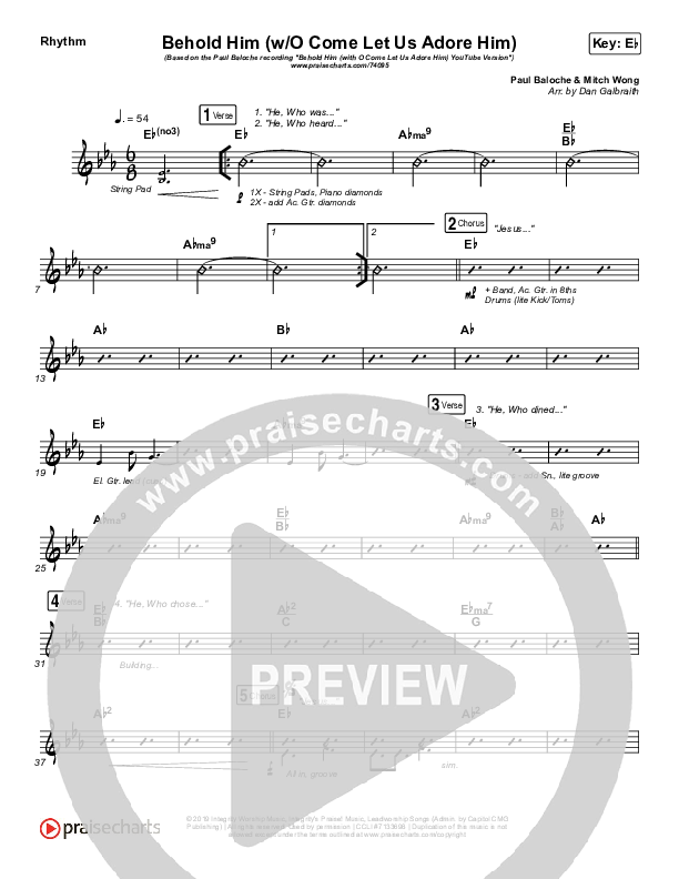Download the Rhythm Chart for Behold Him (with O Come Let Us Adore Him) by Paul Baloche, from the album Behold Him - Single. This song was arranged by Daniel Galbraith in the key of D, Eb.