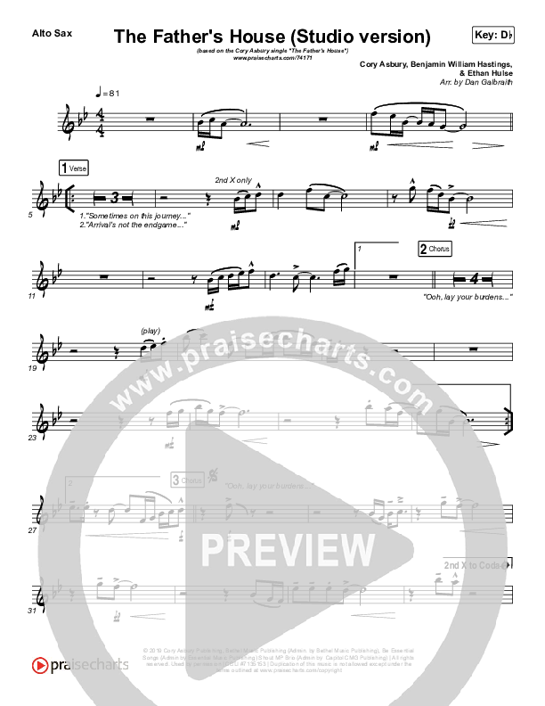 Download the AltoSax sheet music for The Father's House (Studio) by Cory Asbury, from the album The Father’s House. This song was arranged by Daniel Galbraith in the key of Bb, C, Db.