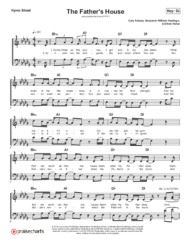 Download the Hymn Sheet for The Father's House (Studio) by Cory Asbury, from the album The Father’s House. This song was arranged by Daniel Galbraith in the key of Bb, C, Db.