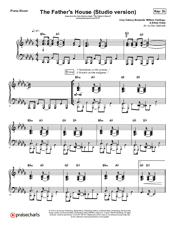 Download the piano sheet for The Father's House (Studio) by Cory Asbury, from the album The Father’s House. This song was arranged by Daniel Galbraith in the key of Bb, C, Db.