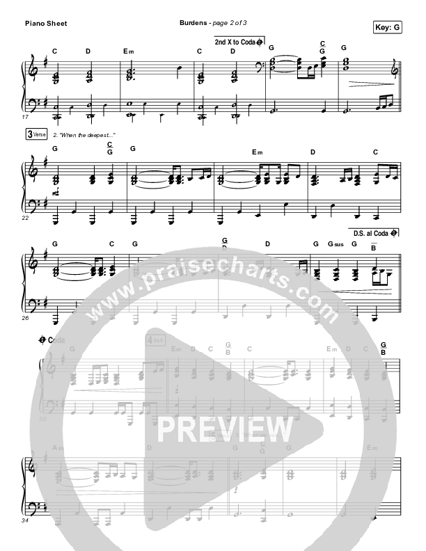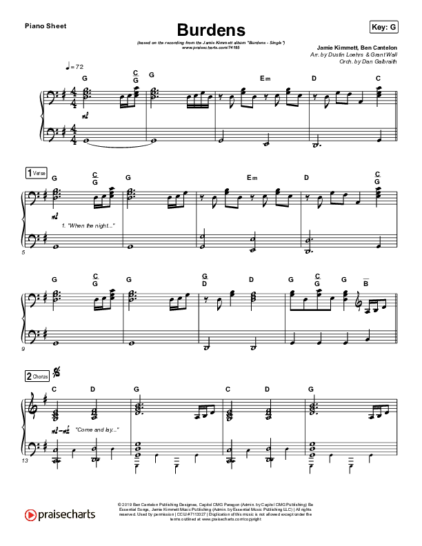 Download the piano sheet for Burdens by Jamie Kimmett, from the album Burdens. This song was arranged by Dustin Loehrs / Grant Wall / Daniel Galbraith in the key of F, G.