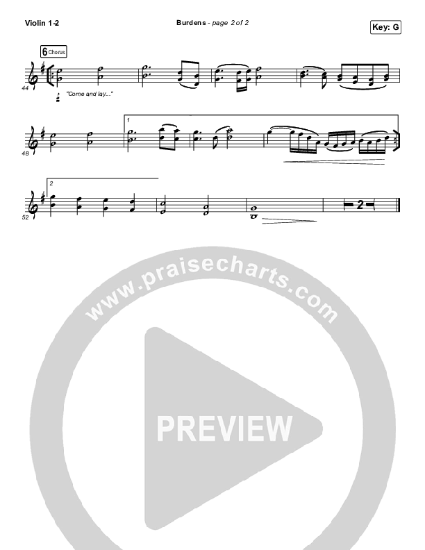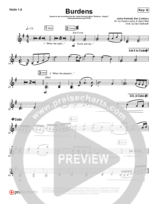 Download the Violin sheet music for Burdens by Jamie Kimmett, from the album Burdens. This song was arranged by Dustin Loehrs / Grant Wall / Daniel Galbraith in the key of F, G.