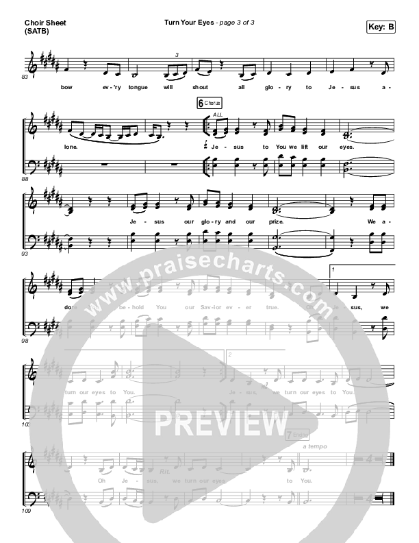 Download the Choir Sheet for Turn Your Eyes by Sovereign Grace, from the album The Glorious Christ. This song was arranged by Dustin Loehrs / Daniel Galbraith in the key of B, Bb, C.