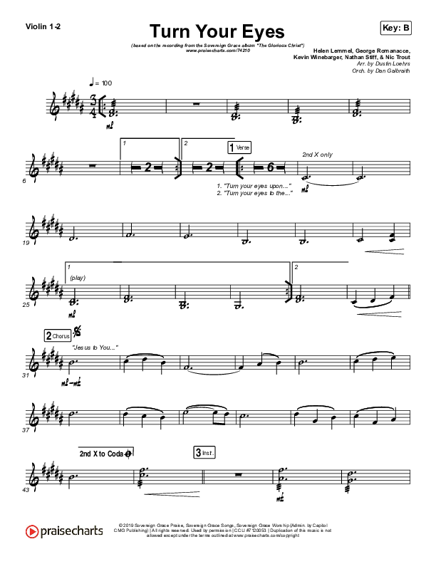 Download the Violin sheet music for Turn Your Eyes by Sovereign Grace, from the album The Glorious Christ. This song was arranged by Dustin Loehrs / Daniel Galbraith in the key of B, Bb, C.