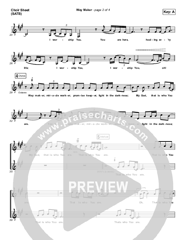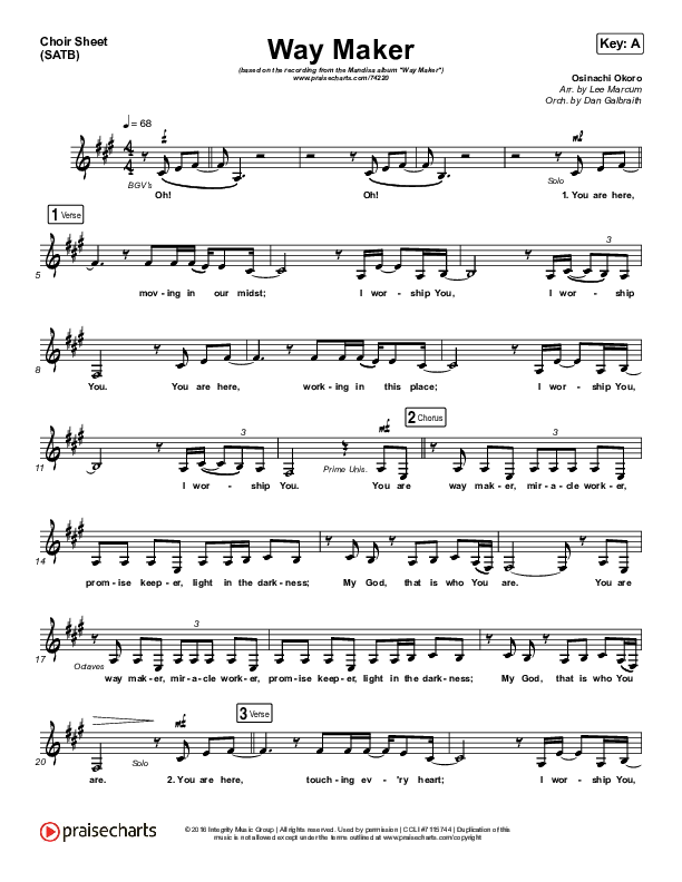 Download the Choir Sheet for Way Maker by Mandisa, from the album Way Maker. This song was arranged by Lee Marcum / Daniel Galbraith in the key of A, Ab.