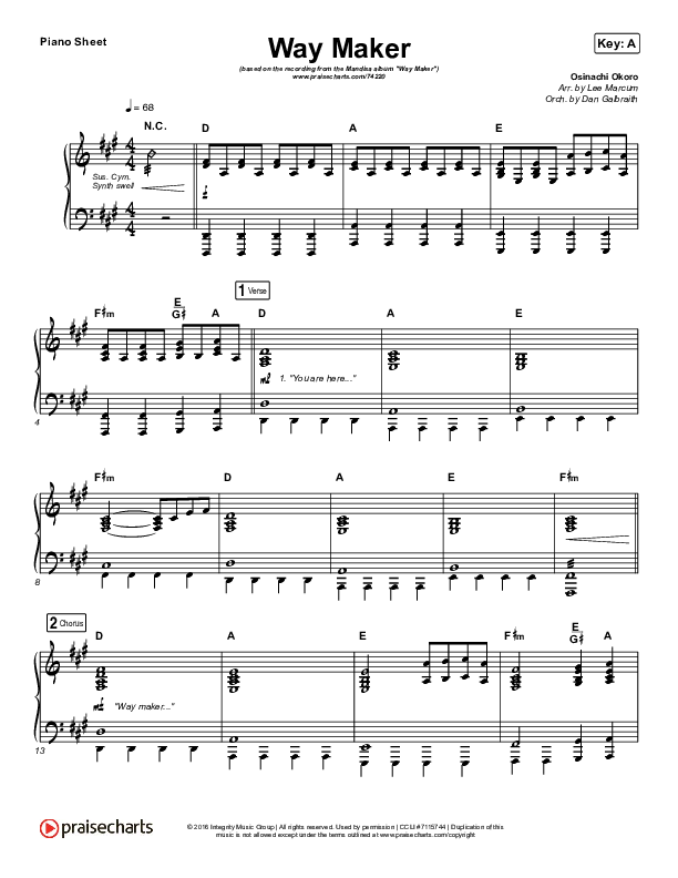 Download the piano sheet for Way Maker by Mandisa, from the album Way Maker. This song was arranged by Lee Marcum / Daniel Galbraith in the key of A, Ab.