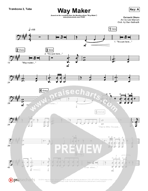 Download the Trombone 3/Tuba sheet music for Way Maker by Mandisa, from the album Way Maker. This song was arranged by Lee Marcum / Daniel Galbraith in the key of A, Ab.