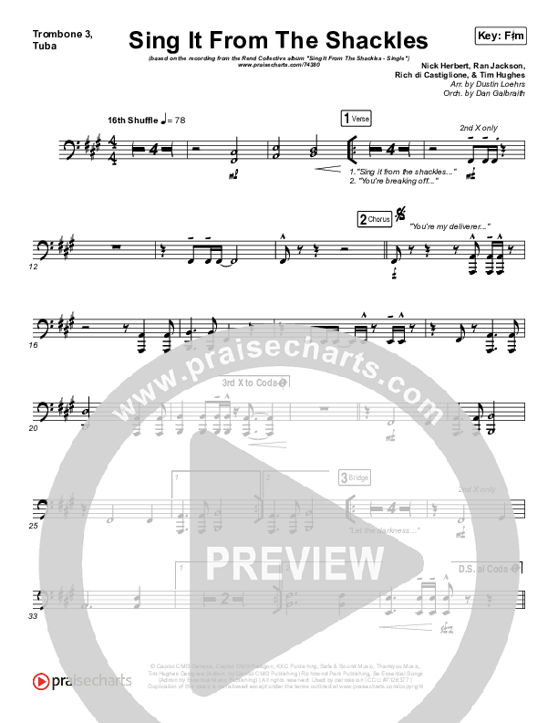 Download the Trombone 3/Tuba sheet music for Sing It From The Shackles by Rend Collective, from the album Sing It From The Shackles. This song was arranged by Dustin Loehrs in the key of F#m, Fm.