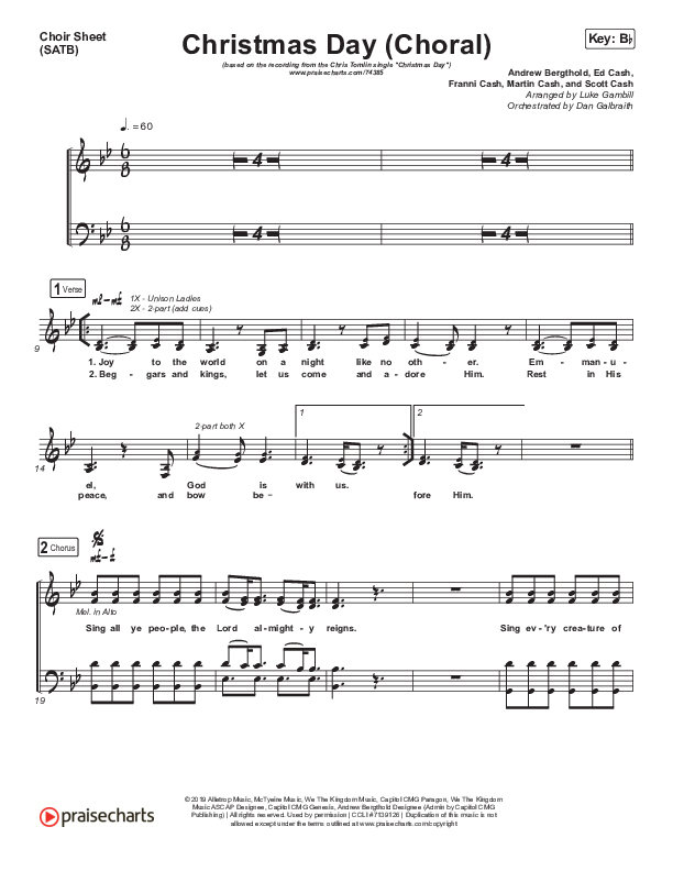 Download the Choir Sheet for Christmas Day (Choral Anthem SATB) by Chris Tomlin / Arr. Luke Gambill, from the album Christmas Day: Christmas Songs Of Worship. This song was arranged by Luke Gambill / Daniel Galbraith in the key of Bb.
