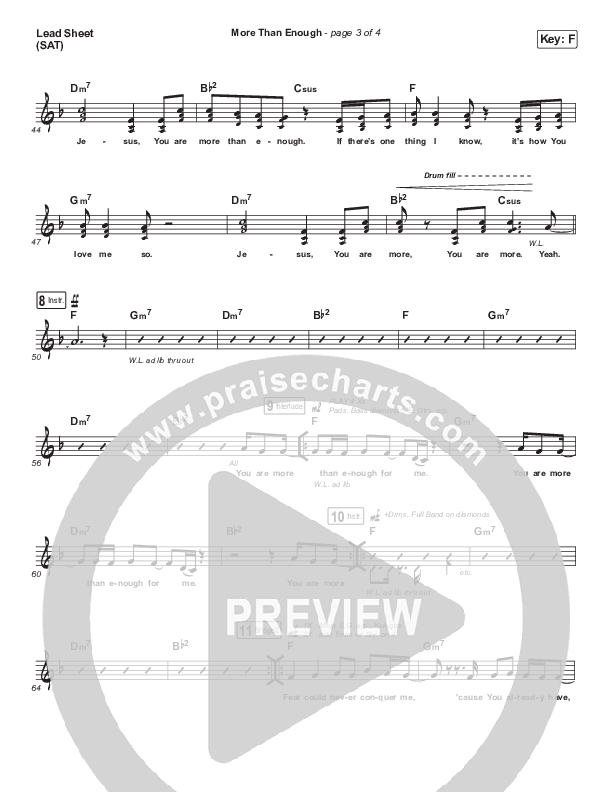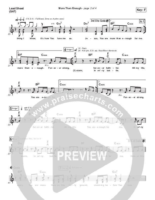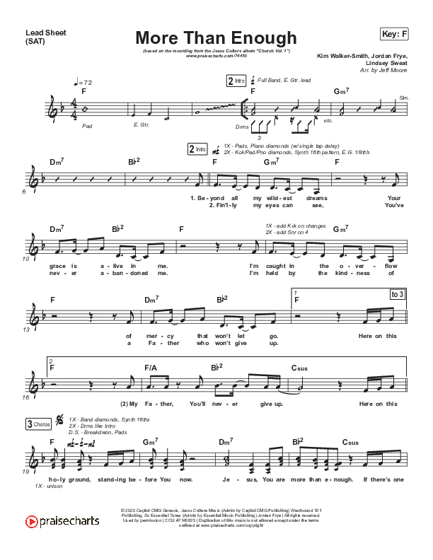 Download the sheet music for More Than Enough (Live) by Jesus Culture / Kim Walker-Smith, from the album Church Volume One (Live). This song was arranged by Jeff Moore in the key of E, F.