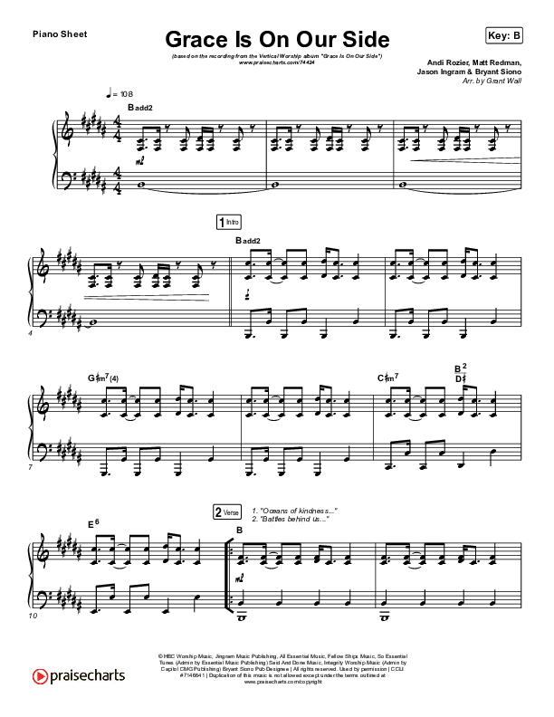 Download the piano sheet for Grace Is On Our Side by Vertical Worship, from the album Grace Is On Our Side. This song was arranged by Grant Wall in the key of B, Bb.