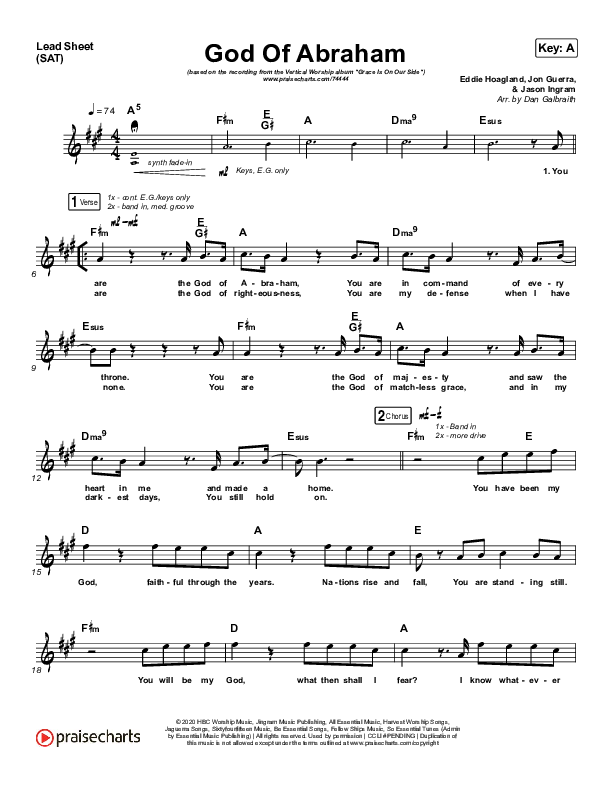 Download the sheet music for God Of Abraham by Vertical Worship, from the album Grace Is On Our Side. This song was arranged by Daniel Galbraith in the key of A, Ab.