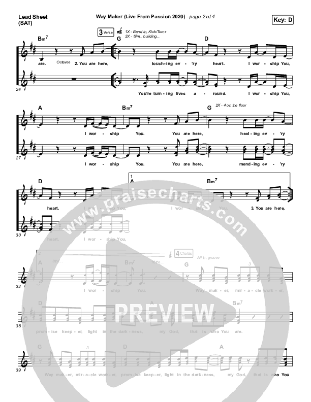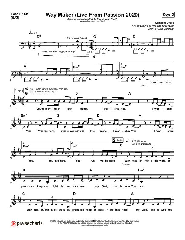 Download the sheet music for Way Maker (Live From Passion 2020) by Passion / Kristian Stanfill / Cody Carnes / Kari Jobe, from the album Roar (Live From Passion 2020). This song was arranged by Wayne Yankie / Grant Wall / Daniel Galbraith in the key of D, Db.