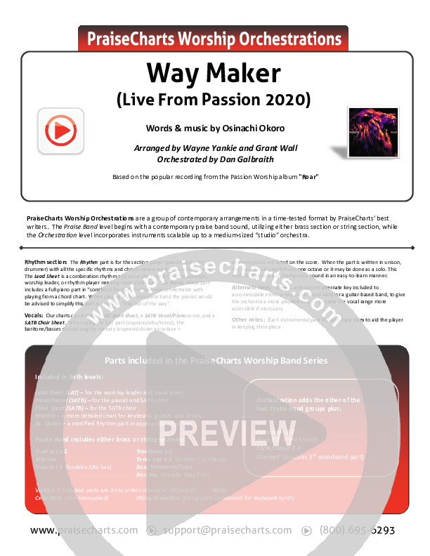 Download the Orchestration for Way Maker (Live From Passion 2020) by Passion / Kristian Stanfill / Cody Carnes / Kari Jobe, from the album Roar (Live From Passion 2020). This song was arranged by Wayne Yankie / Grant Wall / Daniel Galbraith in the key of D, Db.