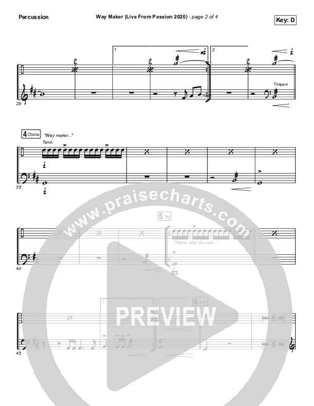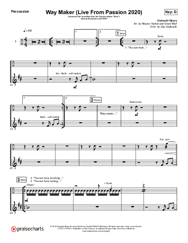 Download the percussion sheet music for Way Maker (Live From Passion 2020) by Passion / Kristian Stanfill / Cody Carnes / Kari Jobe, from the album Roar (Live From Passion 2020). This song was arranged by Wayne Yankie / Grant Wall / Daniel Galbraith in the key of D, Db.