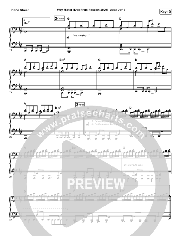 Download the piano sheet for Way Maker (Live From Passion 2020) by Passion / Kristian Stanfill / Cody Carnes / Kari Jobe, from the album Roar (Live From Passion 2020). This song was arranged by Wayne Yankie / Grant Wall / Daniel Galbraith in the key of D, Db.