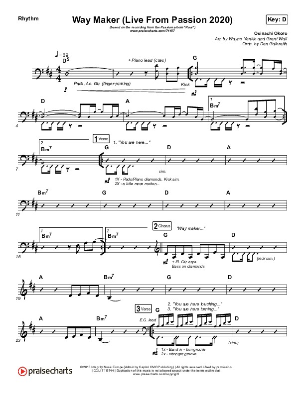 Download the Rhythm Chart for Way Maker (Live From Passion 2020) by Passion / Kristian Stanfill / Cody Carnes / Kari Jobe, from the album Roar (Live From Passion 2020). This song was arranged by Wayne Yankie / Grant Wall / Daniel Galbraith in the key of D, Db.