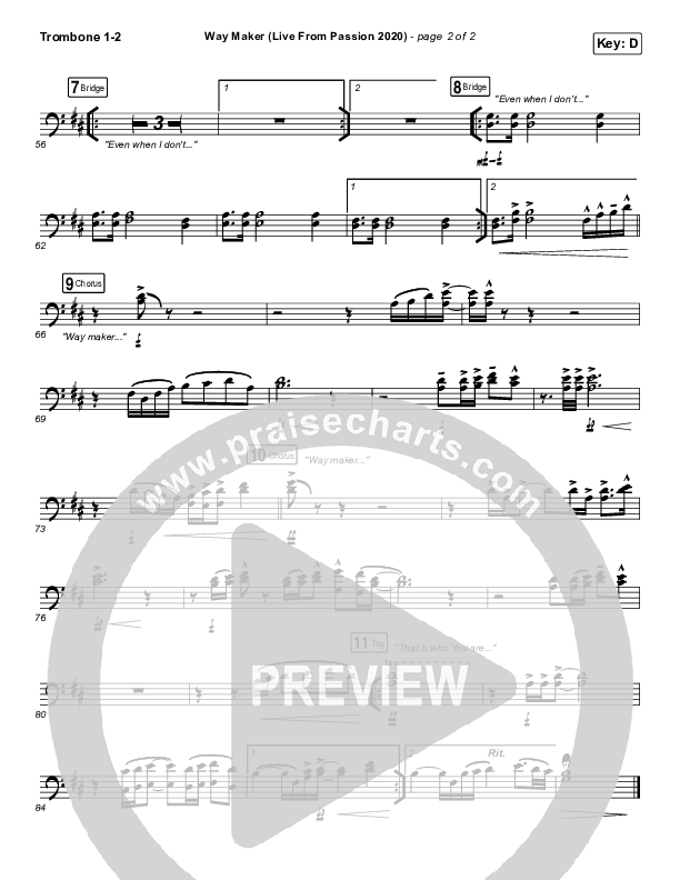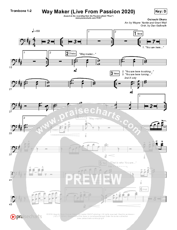 Download the Trombone 1,2 sheet music for Way Maker (Live From Passion 2020) by Passion / Kristian Stanfill / Cody Carnes / Kari Jobe, from the album Roar (Live From Passion 2020). This song was arranged by Wayne Yankie / Grant Wall / Daniel Galbraith in the key of D, Db.
