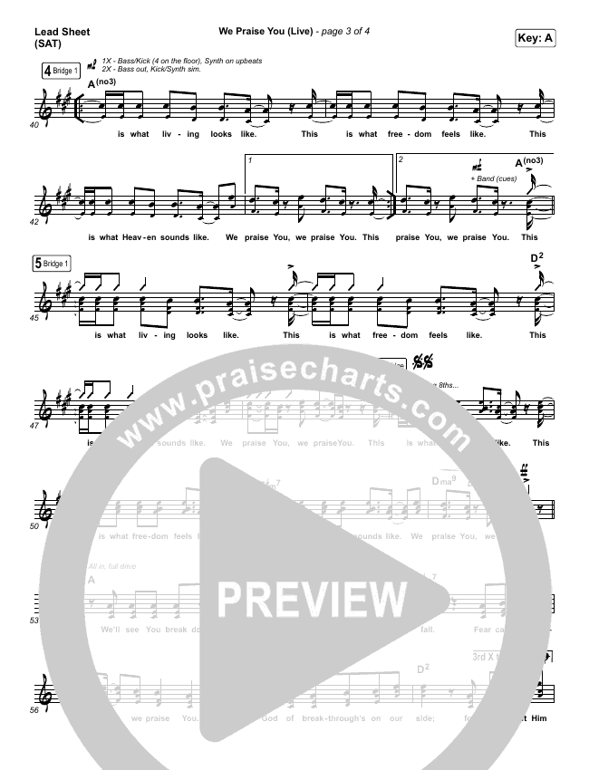 Download the Orchestration for We Praise You (Live) by Bethel Music / Brandon Lake, from the album Revival's In The Air. This song was arranged by Dustin Loehrs / Daniel Galbraith in the key of A, Ab, E.