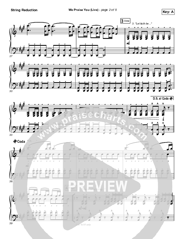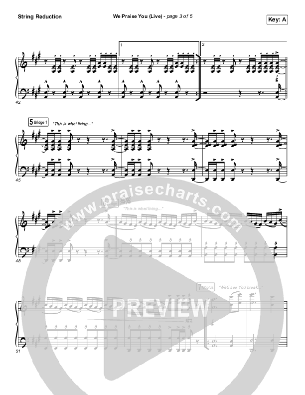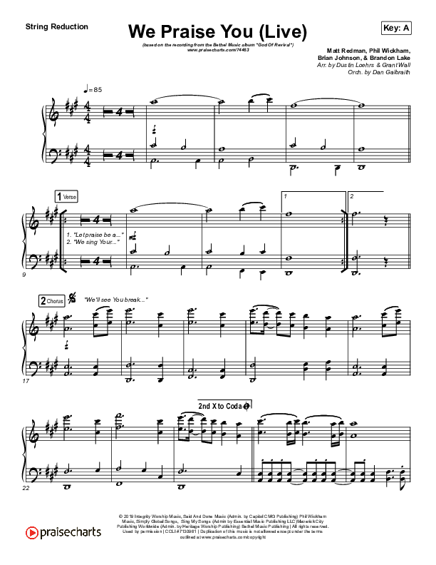 Download the String Reduction sheet music for We Praise You (Live) by Bethel Music / Brandon Lake, from the album Revival's In The Air. This song was arranged by Dustin Loehrs / Daniel Galbraith in the key of A, Ab, E.
