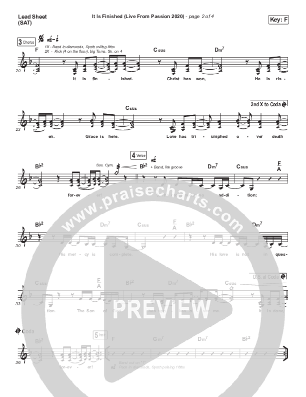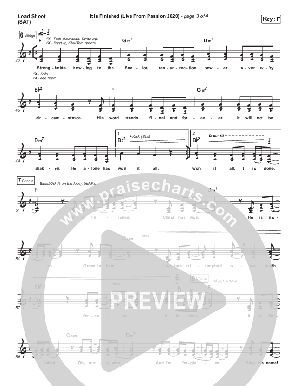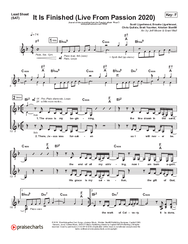 Download the sheet music for It Is Finished (Live From Passion 2020) by Passion / Melodie Malone, from the album Roar (Live From Passion 2020). This song was arranged by Jeff Moore in the key of E, F.